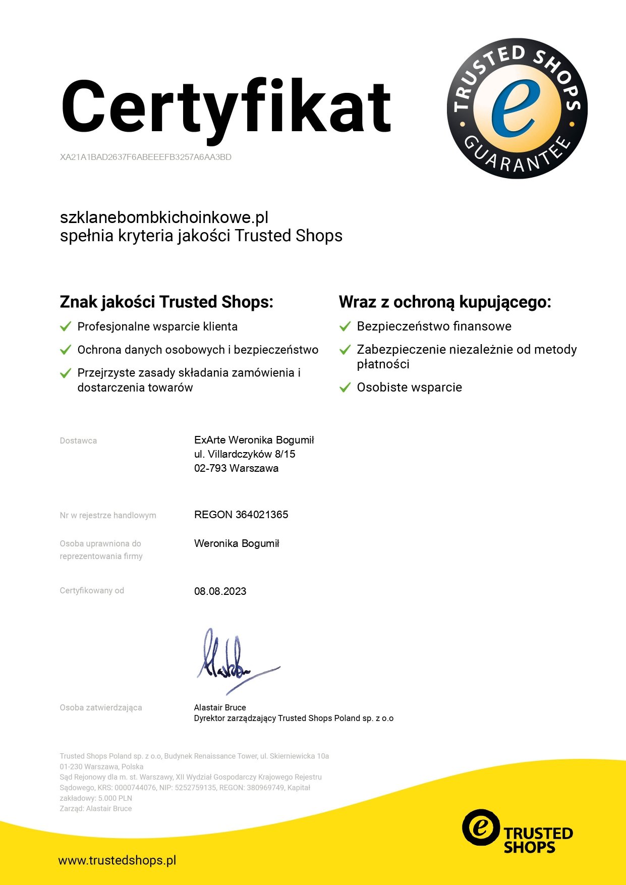 Nasz sklep spełnia kryteria zaufania Trusted Shops, co gwarantuje przejrzyste zasady składania zamówień, płatności i realizowania wysyłek oraz zapewnia maksymalną ochronę kupującego wraz z bezpieczeństwem finansowym. Oto nasz certyfikat